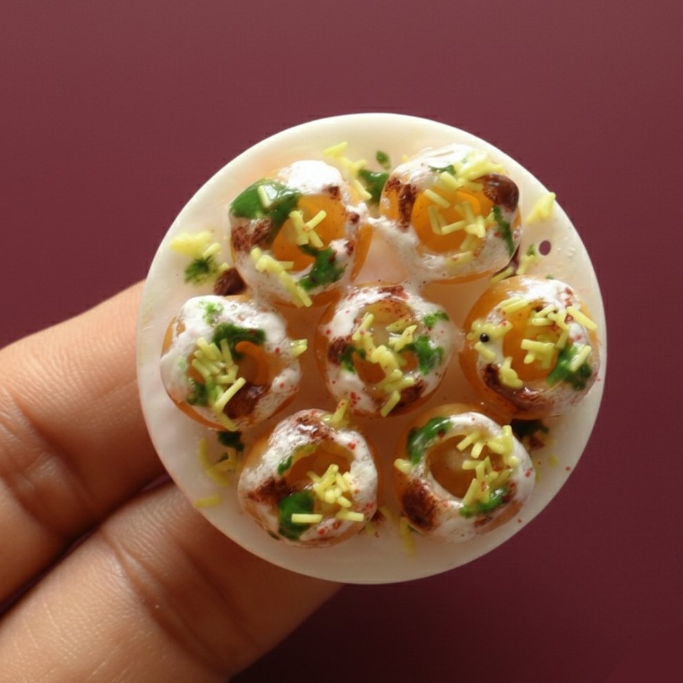 Here is an incredible chaat miniature for you!! This adorable handmade magnet of dahi puri looks absolutely tempting. Delight your near and dear ones with this stunning creation and observe them beam out of joy. Add it as a home decor for that extra charm at your home.