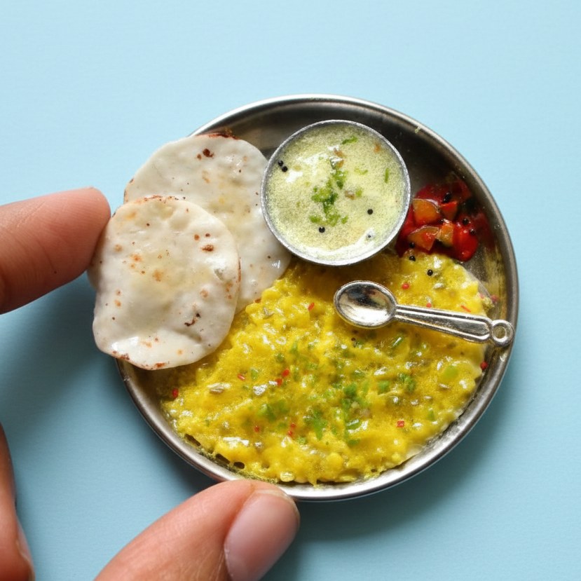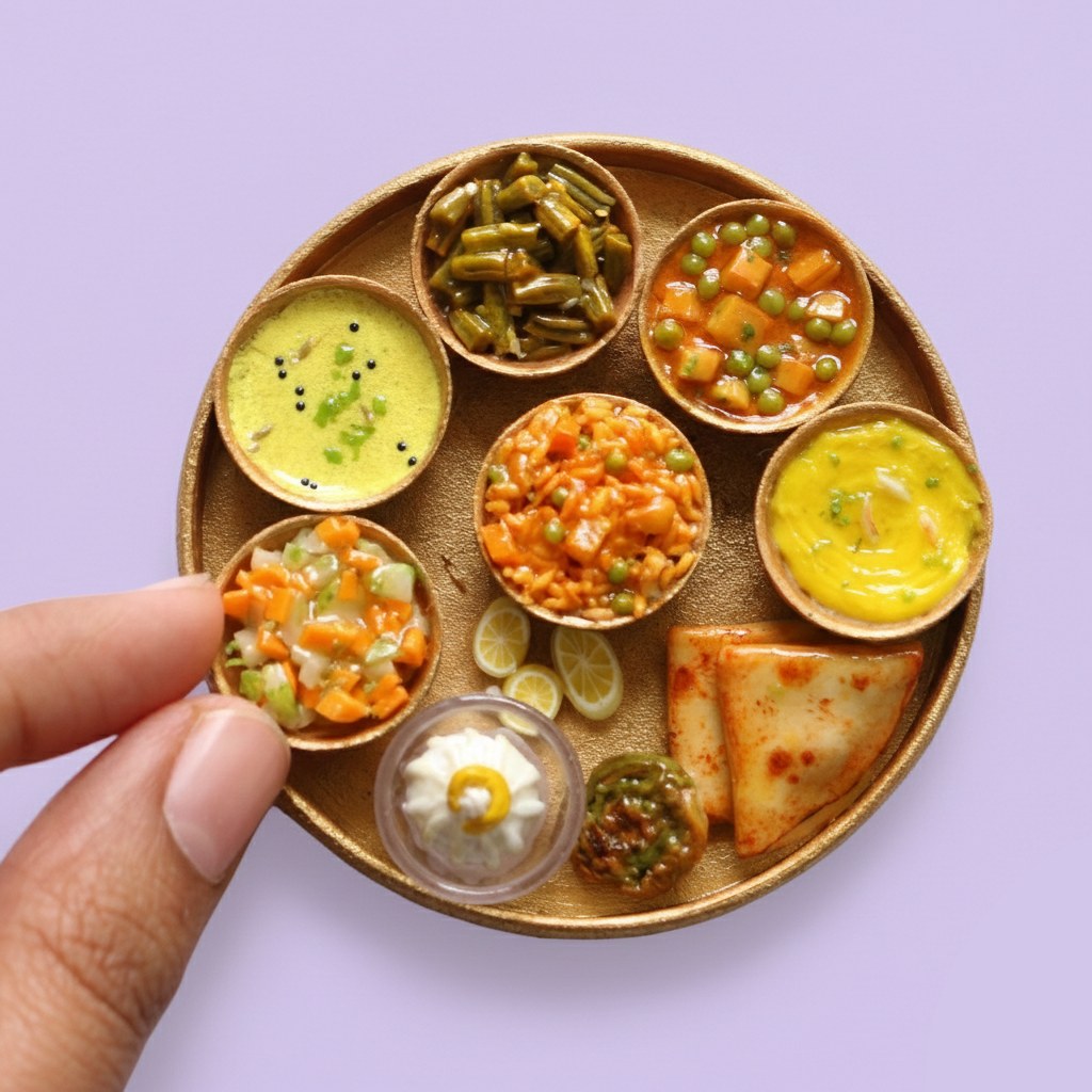 Who can resist a scrumptious plate filled with an array of Maharashtrian delicacies? Here is an exquisite miniature fridge magnet creation which has kadhi, bhindi, aloo matar, amrakhand, chapati, patra, ukadiche modak, koshimbir and masala bhat. It makes for a lovely creation to be owned and a memorable gifting option for all your near and dear ones who love desi Indian food.