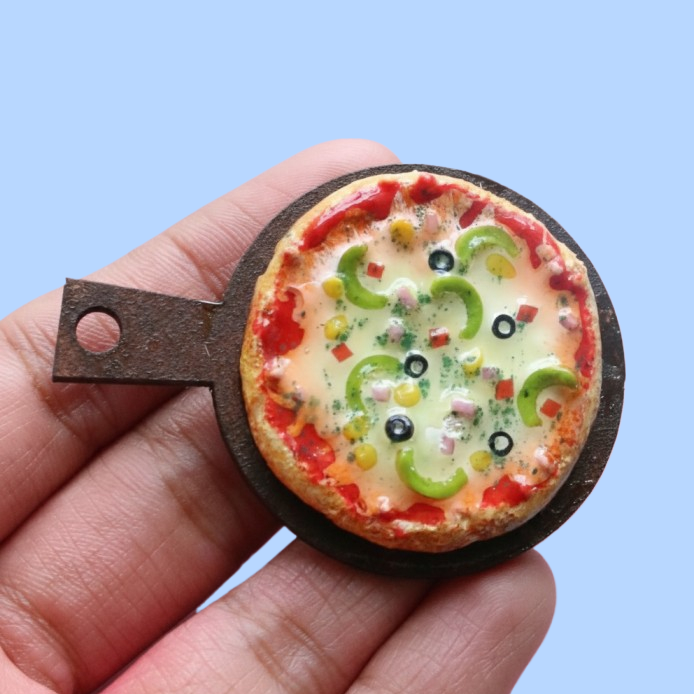Here’s a scrumptious cheesy pizza miniature—a gastronomic tribute to the world-famous dish. Its intricate base features tempting marinara sauce, capsicums, corn, tomatoes, olives, gooey cheese, and crispy chewiness that’ll leave you craving more. This authentic, umami-packed fridge magnet is an amazing, lasting gift for pizza lovers. Yum!